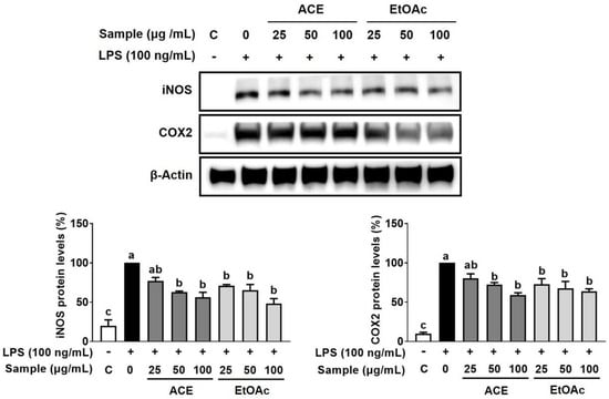 The antioxidant effect by free radical scavenging activity is closely related to the suppression of pro-inflammatory gene expression [19]. Since ACE and its five fractions showed high TPC and total antioxidant activity, we investigated whether the ACE can inhibit LPS-induced inflammation in macrophages. When the cytotoxicity of ACE was measured at 0–100 µg/mL on RAW 264.7 macrophages, cell viability was ~98% at 100 µg/mL ACE (Figure 1a). Thus, the following experiments were performed at ACE concentrations under 100 µg/mL. The mRNA expression of TNFα and IL-1β was significantly elevated by LPS, whereas ACE significantly diminished the LPS-induced expression of TNFα and IL-1β in macrophages (Figure 1b). LPS significantly increased the expression of inflammation-inducible enzymes such as iNOS and COX2 in macrophages, while 100 µg/mL of ACE significantly decreased the mRNA expression of iNOS and COX-2 (Figure 1c). However, 25 and 50 µg/mL of ACE showed minimal effects on the mRNA expression of iNOS and COX2 in LPS-stimulated macrophages. The LPS-increased protein levels of iNOS and COX2 were also noticeably decreased by ACE in macrophages (Figure 2).
