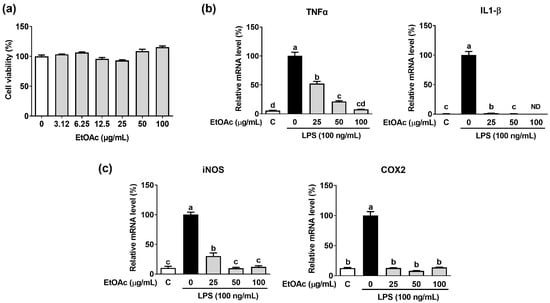 As the EtOAc fraction showed the highest TPC and antioxidant activity among other ACE fractions, we additionally confirmed the inhibitory effect of the EtOAc fraction on inflammation in LPS-stimulated macrophages. We measured the cell viability of the EtOAc fraction in macrophages and found that ~90% of cells were viable when treated 0–100 µg/mL of the EtOAc fraction (Figure 3a). LPS significantly increased TNFα and IL-1β gene expression levels, which were completely abolished by the EtOAc fraction in macrophages (Figure 3b). Additionally, the EtOAc fraction significantly repressed the mRNA expression of iNOS and COX2 in LPS-stimulated macrophages (Figure 3c). Increases in the protein expression of iNOS and COX2 by LPS were markedly decreased by the EtOAc fraction in macrophages (Figure 2).