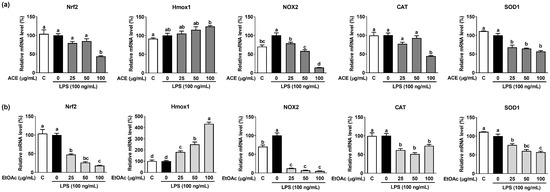 We observed that ACE and its EtOAc fraction have a potent antioxidant effect because of their high TPC and total antioxidant activity. Therefore, the effects of ACE and its EtOAc fraction on the expression of antioxidant genes in LPS-stimulated macrophages were evaluated. LPS significantly stimulated the mRNA expression of NADPH oxidase 2 (NOX2), an enzyme that generates ROS, which was significantly suppressed by ACE and its EtOAc fraction in macrophages (Figure 4a,b). Although the mRNA expression of the other antioxidant genes, such as nuclear factor E2-related factor 2 (Nrf2), catalase (CAT), and superoxide dismutase (SOD1), was not altered by LPS, ACE and its EtOAc fraction significantly suppressed the expression of Nrf2, CAT, and SOD1 in LPS-stimulated macrophages. However, the expression of heme oxygenase-1 (Hmox1) was significantly increased by the EtOAc fraction in LPS-induced macrophages.