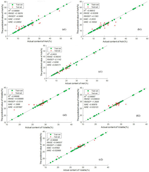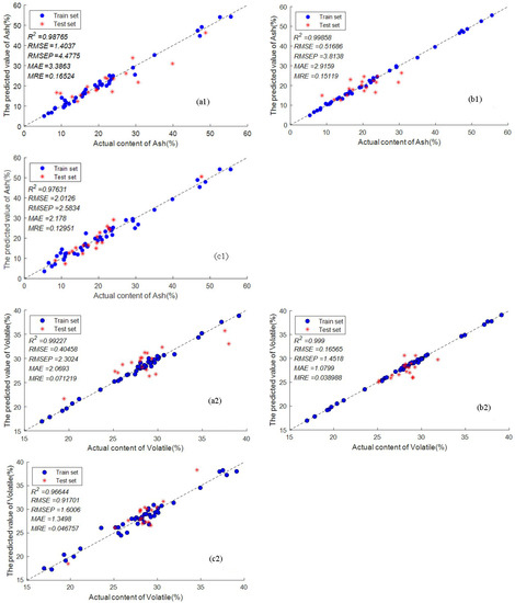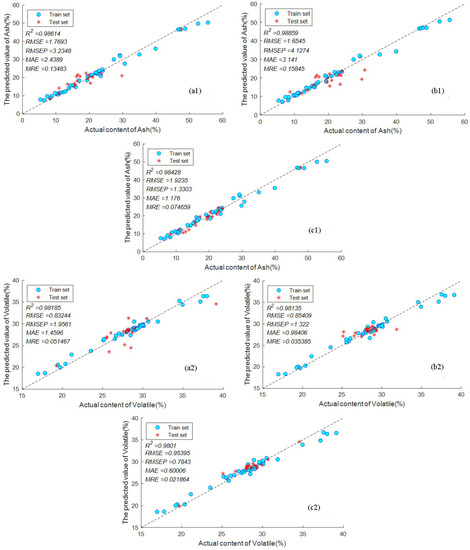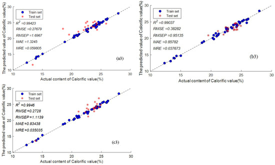 The prediction results of ash content, volatile matter and calorific value of coal by SVR based on (a1–a3) RS; (b1–b3) KS; (c1–c3) SPXY.