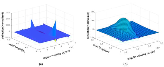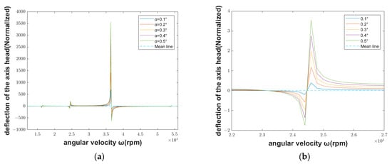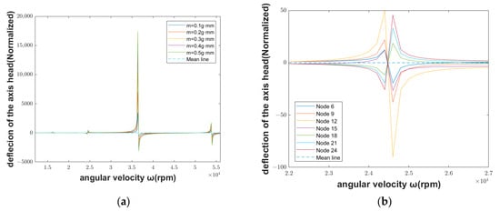 - If the unbalanced mass fault occurs, when the spindle speed is close to the first-order or second-order critical speed, the deflection at the initial end of the spindle is small; when the spindle speed is close to the fourth-order critical speed, the deflection is large. The opposite is true when the spindle inclination fault occurs. It can be seen that the motorized spindle is more sensitive at high rotating speeds when the unbalanced mass fault occurs, and it is more sensitive at low rotating speed when the spindle inclination fault occurs.