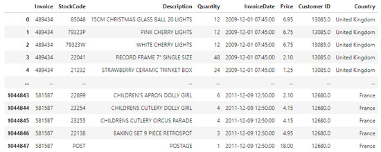 A dataset called “online_retail_II.csv” was used in this study. The dataset contains 1,044,848 transactions from December 2009 to December 2011 and eight variables, including invoice, stockcode, description, quantity, invoice date, price, customer ID, and country. Among those eight variables, four were retained. Table 1 shows the basic information of the dataset.