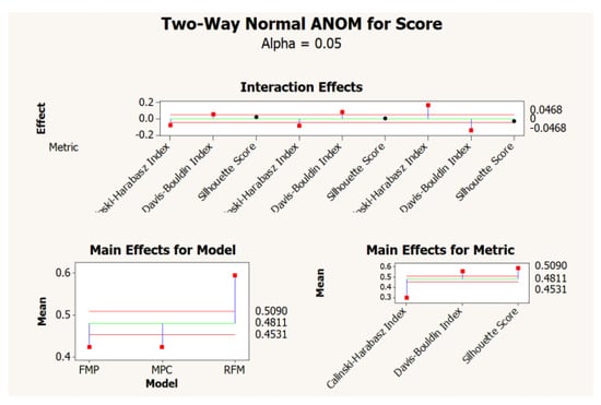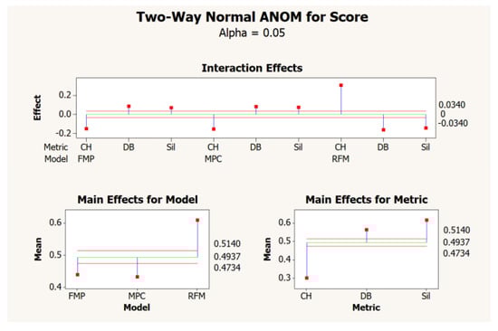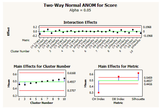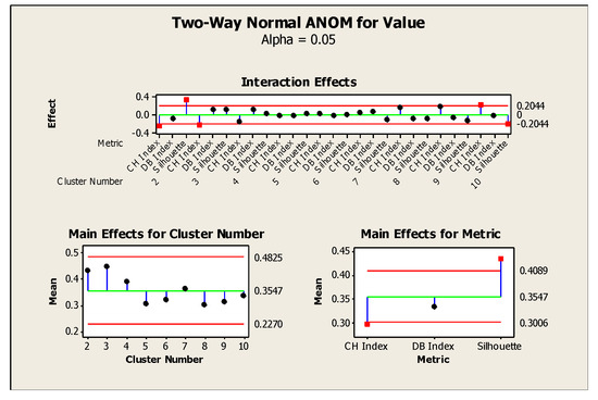 Moreover, the combinations of model and metrics, method and metric, and cluster number and metric exhibit significant interaction effects on the clustering process. Based on these results, further analysis using the analysis of mean approach was conducted to determine the optimal parameters for the clustering process.