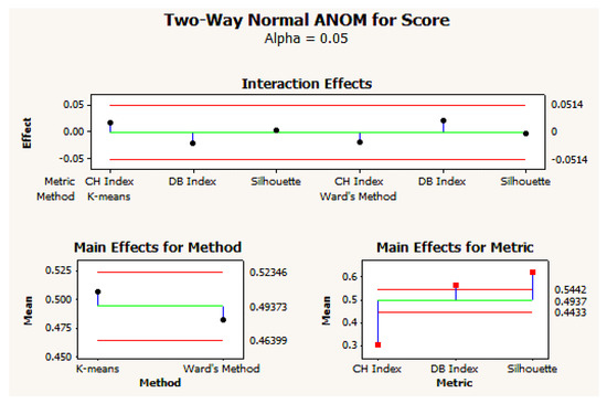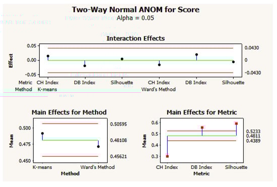 Figure 8 shows the results of the analysis of mean for method and metric in the product-oriented group. The analysis revealed no significant difference between K-means clustering and Ward’s method in terms of the clustering method. Therefore, K-means clustering was chosen based on its flexibility and ease of use.