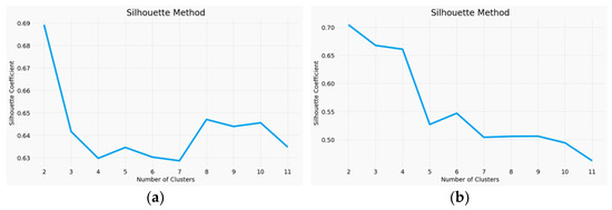 Figure 10 illustrates the results of the Sil analysis for the customer-oriented and product-oriented groups. As mentioned, Sil follows the “higher is better” rule, implying that a higher value signifies better clustering performance. Better performance in the clustering process indicates the ability of clusters to effectively group data based on their characteristics. Figure 10a demonstrates that the highest Sil value is obtained with two clusters, indicating that it is preferable.