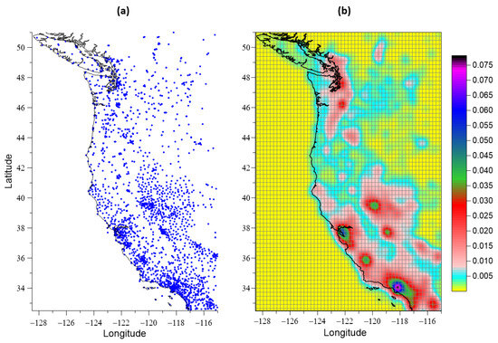 In what follows, we will consider a regular grid of 100 × 150 nodes, covering an area with latitude from 32.5° N to 51° N and longitude from 115° W to 128.5° W. Figure 1a shows the positions of GPS points for measuring displacements of the Earth’s surface. Figure 1b shows the distribution density of GPS stations obtained using the Gaussian kernel estimate [23] at the nodes of this regular grid with a smoothing radius of 0.25° (about 28 km).