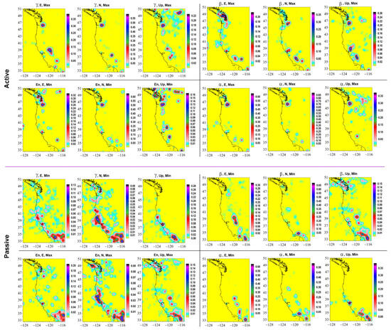 As a result of such assessments, 24 maps of the distribution density of extreme values of tremor parameters were constructed, presented in Figure 3, on which 12 maps for active tremor are in the upper half, and 12 maps for passive tremor are in the lower half.
