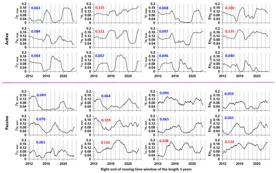 Figure 5 shows graphs of changes in the squares of the components of sequences of correlation matrices for probability density maps of the distribution of extreme values, respectively, for active (12 upper graphs) and passive (12 lower graphs). As noted above, these values are used as weight functions to obtain weighted average probability density maps. The result of such a weighing operation using the principal component method is shown in Figure 4. The graphs in Figure 5 show the average values of the weights calculated for all “long” time windows. For each tremor variant, four maximum average values of weights are highlighted in red—they select those components from matrix (7) that make the greatest contribution to obtaining the weighted average sum of probability densities.