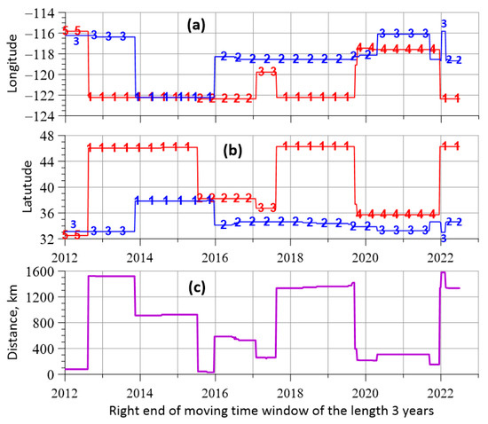 (a,b) represent time sequences of longitudes and latitudes of singular points of tremor with a shift in the time window of 3 years for “active” (red) and “passive” (blue) tremor with cluster membership marks. (c) is the distance between the singular points of active and passive tremor in each time window of 3 years. Numbers along red and blue lines indicate the numbers of the active and passive tremor clusters to which belong the current point of the trajectory. There are time intervals when longitude and latitude trajectories of singular points for different types of tremor are very close to each other.