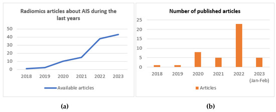 (a) Radiomics articles about AIS patients since 2018. (b) Radiomics articles about AIS published per year.