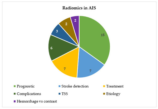 Regarding the application of radiomics in acute cerebral ischemic pathology, there has been an exponential increase in the publication of articles since 2018 (Figure 2). The objectives of these articles on radiomics in acute ischemic stroke are the prognostic prediction of AIS patients, the detection of early ischemic stroke, prediction of the outcome of revascularization treatment, prediction of complications, prediction of the etiology of AIS, prediction of the time since stroke and differentiation between hemorrhage or contrast extravasation in patients undergoing mechanical thrombectomy (Figure 3) (Table 1).