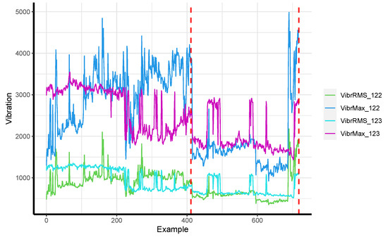 Figure 2 presents the values of the vibration-based attributes calculated for the Basic representation. In addition to the data characteristics, the figure presents when the failures took place in the form of dashed vertical lines. Looking at Figure 1, it can be noticed that around example 220 the characteristics of the measurements recorded by sensor C123 changed. Specifically, the values of VibrRMS_123 and VibrMax_123 decreased noticeably. This change occurs more than two months prior to Failure 1 and it can be interpreted as an indication of an impending failure, in a post hoc analysis. Similarly, it can be noticed that around example 600 the characteristics of the measurements recorded by sensor C122 changed. Specifically, the values of VibrRMS_122 and VibrMax_122 decreased noticeably. This change occurs almost one-and-a-half months prior to Failure 2 and it can be interpreted as an indication of an impending failure, in a post hoc analysis.