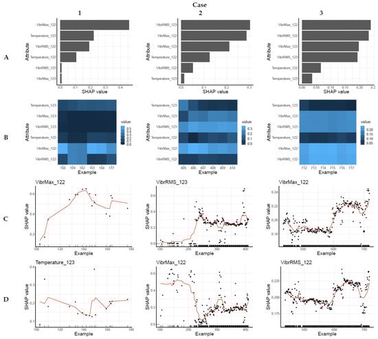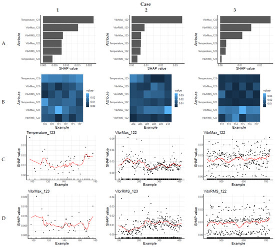 The local context of the SHAP-based explanations is presented in Figure 4B. Although Case 1 presents false alarms, it contains one stable indication that temperature measured by the C123 sensor was important for all decisions considered for this case. In Case 2, the explanations forming the local context differ to such an extent that it is easier to identify what was not important (temperature and RMS of vibration measured by the C122 sensor), than what was important for the presented group of decisions. In Case 3, the local context shows that vibration measurements from the C122 sensor were the most important for this group of model decisions.