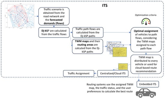 - A new method to create TWM map sets based on traffic flows, using the semi-disjoint k-shortest paths (Dj-kSP) linking their origin/destination nodes [13,18]. These semi-disjoint k-shortest paths define the best low-overlapping routes for each flow and are used to create routing zones that promote traffic usage through them.