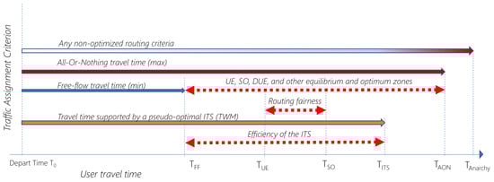 - van-Essen, M.; Thomas, T.; van-Berkum, E.; Chorus, C. From User Equilibrium to System Optimum: A Literature Review on the Role of Travel Information, Bounded Rationality and Non-Selfish Behaviour at the Network and Individual Levels. Transp. Rev. 2016, 36, 1–22. [Google Scholar] [CrossRef]