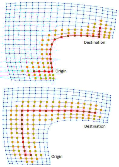- Smallest/largest free-flow edge weight , . If the MaxW is selected, the algorithm quickly selects highly disjoint paths though similar weighted paths are not considered. On the other hand, MinW enables a detailed full-scan approach.