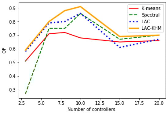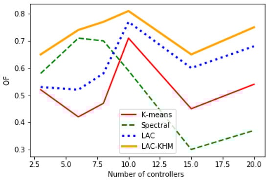 Figure 3 indicates the fact that the CLAC-KHM is the most efficient rather than the other representative algorithms. Meanwhile, it depicts that when there are a small number of controllers, the spectral clustering outperforms k-means in terms of OF, and contrarily, with increasing controller numbers, k-means has better results. It is worth bringing up the fact that they have no predictable behaviors in Intellifber.