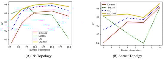 In this section, CLAC-KHM is first compared to k-means, spectral, and LAC, and afterwards, they are all analyzed in a similar condition on four real internet zoo topologies on different scales. The initial values of the objective function in this study are shown in Equation (16):