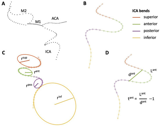 (A) Centerline of the main cerebrovascular vascular arteries: internal carotid artery (ICA), anterior cerebral artery (ACA), segments M1 and M2 of the middle cerebral artery; (B) division of the ICA in four bends for the extraction of geometric parameters; (C) radius of curvature of the fitting circle of each ICA bend; (D) example of calculation of the bend tortuosity (for the anterior bend).