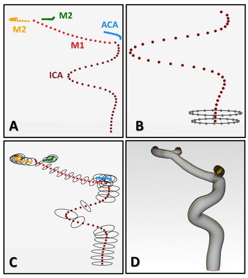 (A) Centerline and label recognized by the Python code (ICA in dark red, ACA in blue, M1 in red, M2 as ICA-M1 continuation in orange and the other M2 in green); (B) examples of first sections discretized with 20 points; (C) all the considered discretized sections (based on local curvature features to avoid self-penetration); (D) final 3D representation of the vessel.
