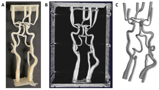 (A) Silicone phantom of the intracranial arteries with complete circle of Willis anatomy and inner 3D-printed lumen; (B) segmented domain in the VMTK software; (C) segmented STL geometry of the cerebrovascular phantom with the internal lumen wall in dark gray and the thickness in light gray.
