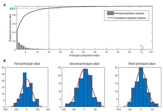 (A) PCA analysis of the cerebrovascular anatomies: 15 principal components represent 95% of the variance; (B) example of the three principal values and their normal fitting (red lines).