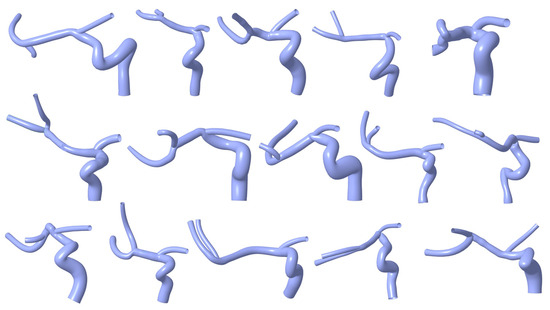 Figure A1 shows a comparison of the distributions of the 15 principal values describing the cerebrovascular anatomies in the training and generated datasets. As expected, the distributions are similar in the two datasets. The Mann–Whitney U-test was used to assess whether the principal values in the generated and training datasets could be described by distributions with equal medians. This was confirmed for all 15 principal values.