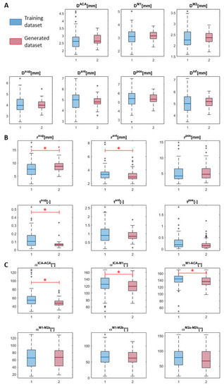 Boxplots of the geometric parameters’ distributions in the training and generated datasets: (A) diameters; (B) bend curvature and tortuosity; (C) angles at the bifurcations. The red asterisks indicate distributions with different medians (Mann–Whitney U-test).