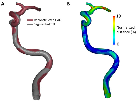 (A) Segmented STL geometry of the phantom lumen (gray) superimposed on the reconstructed CAD geometry (red); (B) contour map of the absolute distance between STL and CAD geometry normalized with the local diameters plotted on the CAD geometry.
