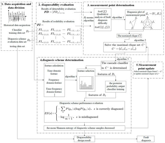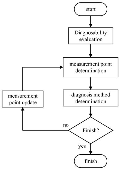 In the process of actual fault diagnosis, a complete fault diagnosis scheme needs to clarify two basic aspects: where to extract signals, i.e., the selection of measurement points; and how to process the extracted signals so that the faults can be diagnosed, i.e., the determination of the diagnosis method. Both the selection of measurement point and the diagnosis method can affect the effect of diagnosis. In order to take the influence of both into account and improve the fit of both factors, the flow chart of the diagnosability integrated design method proposed in this paper is shown in Figure 2.
