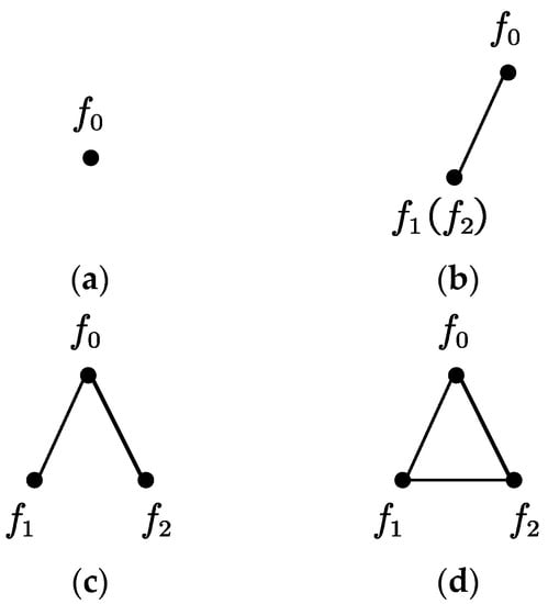 Forms of the diagnosis plot of measurement point of three-state system. The dots in the figure represent the states of the system, and the connecting lines between the dots represent that the two states are distinguishable. The subfigures (a–d) show the four cases of whether the states of the three-state system are distinguishable or not, respectively.