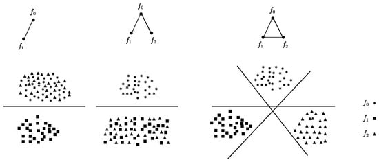 Among the four cases shown in Figure 3, (a) indicates that the measurement point is insensitive to both faults and cannot detect the occurrence of faults; (b) indicates that the measurement point can only detect one of the faults but not the other; (c) indicates that the measurement point can detect both faults but cannot distinguish between them; (d) indicates that the measurement point can detect and isolate both faults. In the diagnosability design of this test point, the information reflected by the test point in case (a) was too little, so it was not considered in this paper. The remaining three cases were discussed in this paper, and the distribution of samples in the feature space corresponding to these three cases is shown in Figure 4.