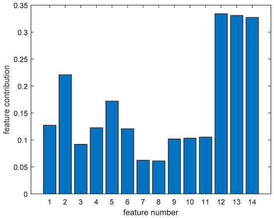 Using the Bron–Kerbosch algorithm to analyze the diagnosis plot of measurement point and extract maximal cliques, a total of four maximal cliques can be extracted from the diagnosis plot of measurement point shown in Figure 7, which is recorded as . We can obtain from using Algorithm 2, and according to Algorithm 3, the design result of cascade classifier based on the maximal clique can be obtained: using the data of measurement point 6, the five states of the system were identified. Algorithm 4 was used to calculate the contribution of each feature to the diagnosis, which is shown in Figure 8. Finally, feature 12 and 13 were selected to distinguish the system state, and then, a complete fault diagnosis scheme can be obtained.