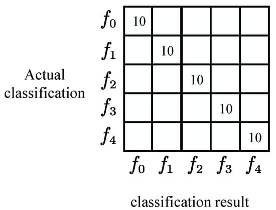 In this paper, the feature vectors were recombined by means of horizontal splicing of the data from multiple measurement points. In performing the diagnosis, the data set (a total of 5 × 30 groups of samples) was used for training, and the data sets and (a total of 5 × 20 groups of samples) were used for testing. The fault diagnosis results are shown in Table 3, and the table shows the number of samples that were incorrectly diagnosed.