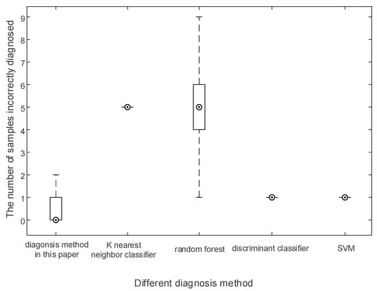 Figure 11 shows the statistical results of the diagnosis of different fault modes in 50 repeated experiments. From the statistical results, the median number of incorrectly diagnosed samples of this paper’s method was 0, and the maximum value was 2, which indicates that at least in half of the experiments, this paper’s method was able to correctly diagnose all the samples, and the number of incorrectly diagnosed samples of the worst diagnosis result was 2. This diagnosis result was already better than that of the KNN and the random forest (the minimum value of the number of incorrectly diagnosed samples of the two methods was 5 and 2, respectively), while for the use of discriminative classifier and SVM, both methods performed stably in 50 repetitions, and their number of incorrectly diagnosed samples was 1.