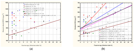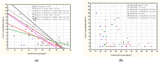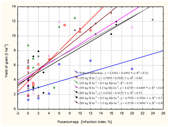 The coefficient of determination (R2) shows that the grain yield was determined in most experimental plots by the Fusarium spp. infestation (except in the plot where 150 kg N ha−1 and 0.5 kg Mn ha−1 were applied) (Figure 5).