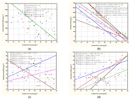 Dependence of content of N on the number of mycotoxins in wheat grain: deoxynivalenol (DON) (a), nivalenol (NIV) (b), moniliformin (MON) (c), zearalenone (ZEA) (d), calculated at significance α = 0.05).
