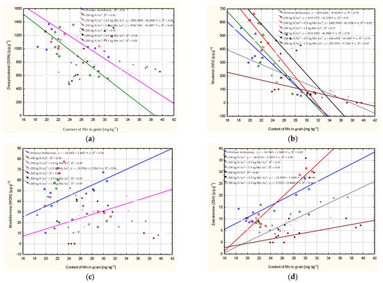 Dependence of content of Mn on the number of mycotoxins in wheat grain: deoxynivalenol (DON) (a), nivalenol (NIV) (b), moniliformin (MON) (c), zearalenone (ZEA) (d), calculated at significance α = 0.05).