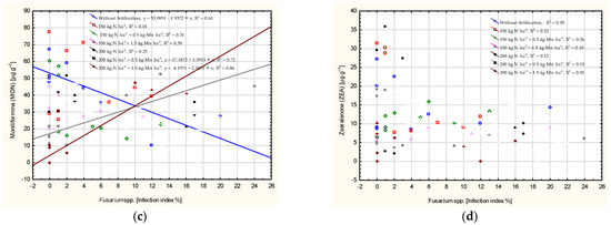 The DON level was determined at 71% by the occurrence of Fusarium spp. following the application of 200 kg N ha−1 and 1.5 kg Mn ha−1 (Figure 4). The coefficient of determination for the NIV level exceeded 50%, except in plots where 150 kg N ha−1, 0.5 kg Mn ha−1 (R2 = 0.35) and 200 kg N ha−1 were applied (R2 = 0.47). The MON level was determined by grain contamination with Fusarium spp. in the no-fertilisation plot (R2 = 0.61) following the application of 200 kg N ha−1 with Mn (R2 = 0.72–0.86). The ZEA level was not determined by Fusarium spp. infestation.
