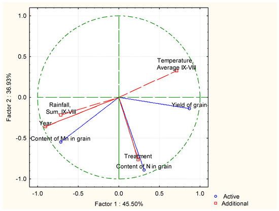 The diversity of nitrogen and manganese content during the study years was an effect of varied yield (a higher yield in 2014 corresponded to a low N and Mn content, and a low grain yield in 2016 corresponded to a high N and Mn content of grain). The low nutrient content of grain in high-output cultivation is associated with intensive yield mass growth relative to mineral component absorption [35]. The effects of dilution of mineral components in the yield are presented in papers by Murphy et al. [36], Hussain et al. [37], Guttieri et al. [38] and Smith et al. [39] and not confirmed in studies by Shi et al. [40], Hamnér et al. [41] and Marles [42].