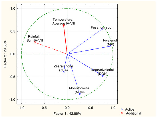 The analysis of the impact of weather conditions (rainfall and temperature) and the use of nitrogen and manganese fertilisation in winter wheat cultivation on the content of N, Mn, grain yield, ear infection by Fusarium spp. and the content of mycotoxins in grain was complemented by the determination of the correlation between the above-mentioned factors. To this end, the principal component analysis (PCA) method was used to determine the links (the strength and direction of the correlation) between the measurement variables. PCA showed that the air temperature in the growing seasons (September–August) had an effect on grain yield (Figure 6). The fertilisation variant had an impact on the formation of nitrogen content in the grain. The year of cultivation and the amount of rainfall affected the content of manganese in grain. The performed PCA showed that the temperature (IV–VIII) had an effect on the infection of spikes by Fusarium spp. (Figure 7). During the growing season in spring and summer, temperature and rainfall had no effect on the development of MON and DON mycotoxins.