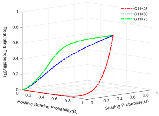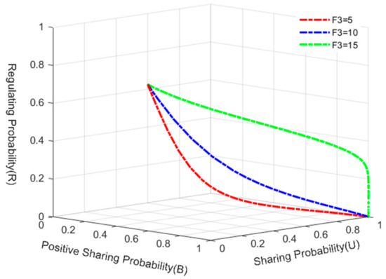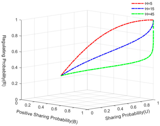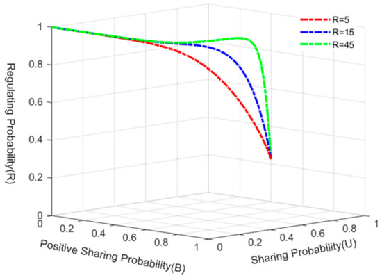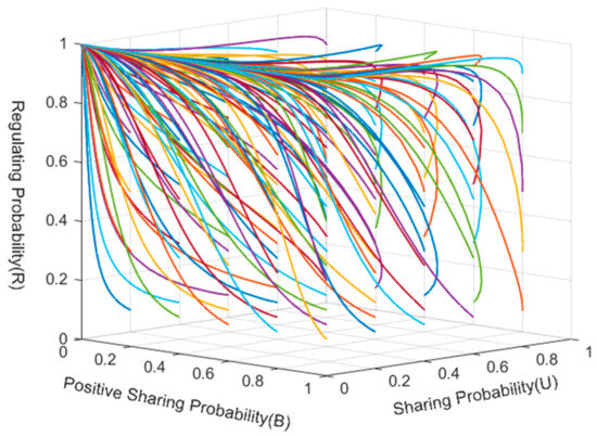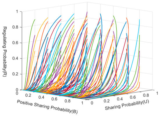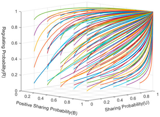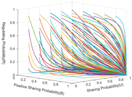 - Regulatory benefits (). The basic revenue generated by the regulator node choosing to regulate the ecological node is R. The additional revenue coefficient obtained from the successful urging business organization nodes to positively participate in sharing is α(α∈[0, 1]), and the additional revenue coefficient obtained from the successful urging common user nodes to participate in sharing is β(β∈[0, 1]).