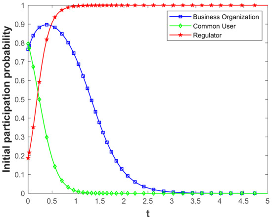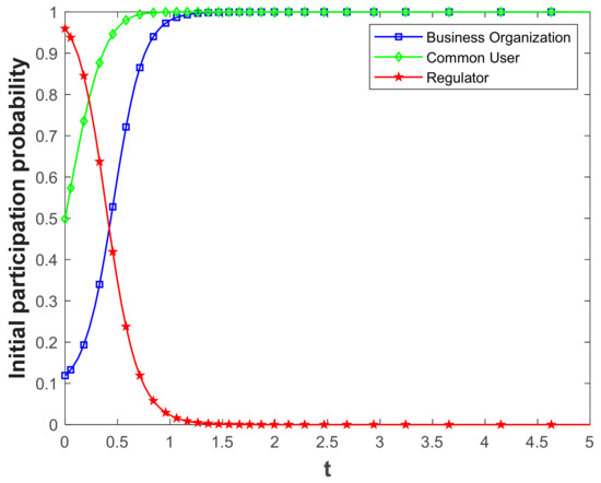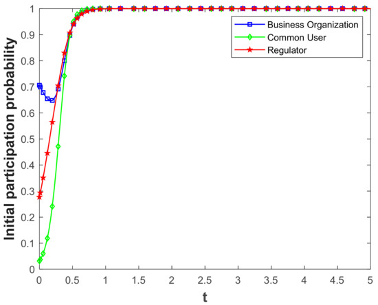 - The probability of business organization nodes choosing to participate in positively sharing is complementary to the probability of common user nodes choosing to participate in sharing, which increases with the increase in the participation probability of the other party.