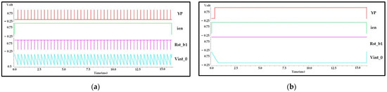 In frequency encoding’s functioning mode, the integral capacitor must be periodically reset. Consequently, when designing the actual circuit, the latency of the comparator, the size of the reset switch, and the value of the integral capacitor are the most crucial factors that must be carefully considered. As depicted in Figure 7, a half-side Schmitt trigger has been implemented to reduce comparator latency. The input signal range and counting period must be utilized to optimize the size of the reset switch and the value of the integral capacitor. Figure 8 depicts the simulation results of the circuit in frequency-encoding mode and time-encoding mode, respectively.