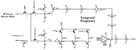 Different integration capacitors are designed for frequency-encoding mode and temporal encoding mode, respectively (100 fF for frequency-encoding mode, 900 fF for temporal encoding mode), as shown in Figure 10. The integral capacitor working in frequency-encoding mode is small and can be quickly filled to generate pulses. The integration capacitor working in temporal encoding mode is relatively large. Under the minimum PD current, the capacitance integration time covers the entire technical cycle as much as possible. Only one pulse is generated to reduce circuit energy consumption.