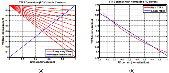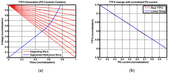 During the actual simulation process, we discovered that the linearity problem between PD current and spike delay cannot be resolved using only a single slope reference signal (scheme B). Figure 13a depicts two signals connected to the comparator in temporal encoding mode, the PD signal and the signal, and the horizontal axis represents time (normalized by the integration period). The TTFS spike delay generated by this circuit exhibits strong nonlinearity with the input PD, as depicted in Figure 13b.