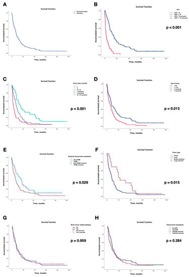 - Cacho-Díaz, B.; Lorenzana-Mendoza, N.A.; Chávez-Hernandez, J.D.; González-Aguilar, A.; Reyes-Soto, G.; Herrera-Gómez, Á. Clinical manifestations and location of brain metastases as prognostic markers. Curr. Probl. Cancer 2019, 43, 312–323. [Google Scholar] [CrossRef] [PubMed]