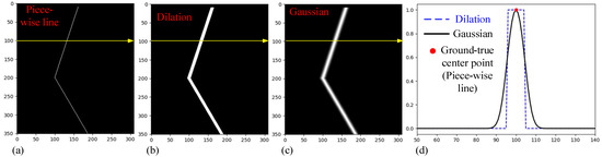 - When extracting the grayscale value along the x direction using the simulated laser stripe images in Figure 7a, it becomes evident that the present of zero-mean Gaussian noise with different sigma values exerts a noticeable impact, as illustrated in Figure 7b. The location of the piece-wise line in this row (marked by the red dot) serves as the ground truth for comparison;