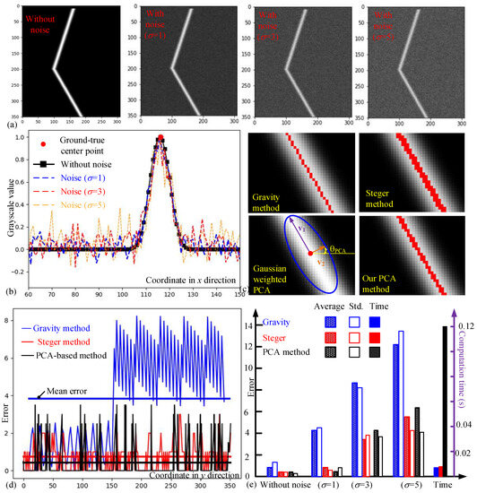 - Figure 7e and Table 2 show insights into the sensitivity of different methods to noise. The gravity-based method proves to be highly sensitive to noise, while both the Steger and our method demonstrate relatively high robustness. With respect to the extraction time, the Hessian-matrix-based method is computationally expensive, whereas the proposed PCA-based method achieves similar accuracy at a speed that is 10 times faster.