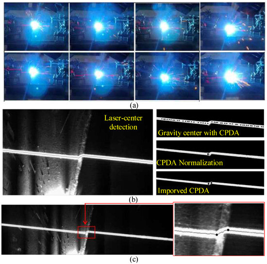- With the binarization pre-processing, the laser center line can be easily detected in the left column of Figure 10b. However, when calculating the feature corner points with only the CPDA algorithm, a multitude of pseudo-corners are generated. Moreover, the application of normalization to filter the corners obtained through CPDA results in the omission of some corners;